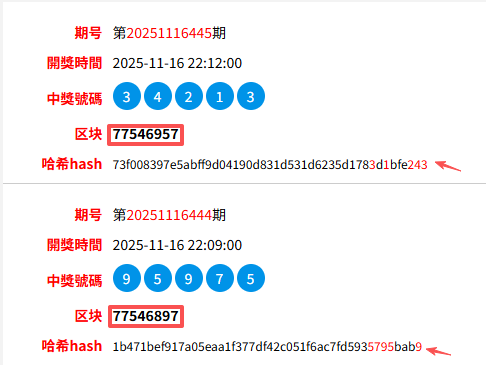 哈希时时彩B说明: 系统会依据波场(TRON)公链上每3秒一条的区块哈希值,先省略掉前面16位后从右往左读取5位数字(可重复)做为开奖结果。 1 若罕见出现数字不足5位,则该期取消,不开奖。 2 每天固定读取北京时间早7:01整的公链哈希为第一期开奖结果,后每180读取开出下一期(如公链罕见出现不是3秒一条,为避免争议,系统最终还是以180秒最接近的下一条数值为下期开奖依据),次日北京时间早4:01为最后一期,全天420期。全年365天不休息。 Q1、什么是区块哈希值(Block hash)? 区块哈希值是一段数据的DNA,每个区块哈希值都是唯一的、随机的,且不可篡改。 点击查看哈希值介绍(https://baike.baidu.com/item/Hash/390310) Q2、什么是区块链? 区块链从本质上来讲,它是一个共享数据库,存储于其中的数据或信息,具有不可伪造、全程留痕、可以追溯、公开透明、集体维护等特征。 点击查看区块链介绍 (https://baike.baidu.com/item/%E5%8C%BA%E5%9D%97%E9%93%BE/13465666) Q3、如何在链上验证开奖结果? 1、通过点击红色箭头位置的区块哈希值,可以直接跳转至波长浏览器,对比两者数据是否一致; 2、或手动打开波长浏览器(https://tronscan.org),在网页最上方的搜索框输入下图方框中的数值,点击搜索后,在搜索框下方第三行出现的“Block Hash”数值,即为对应的本期开奖结果的区块哈希。![]()